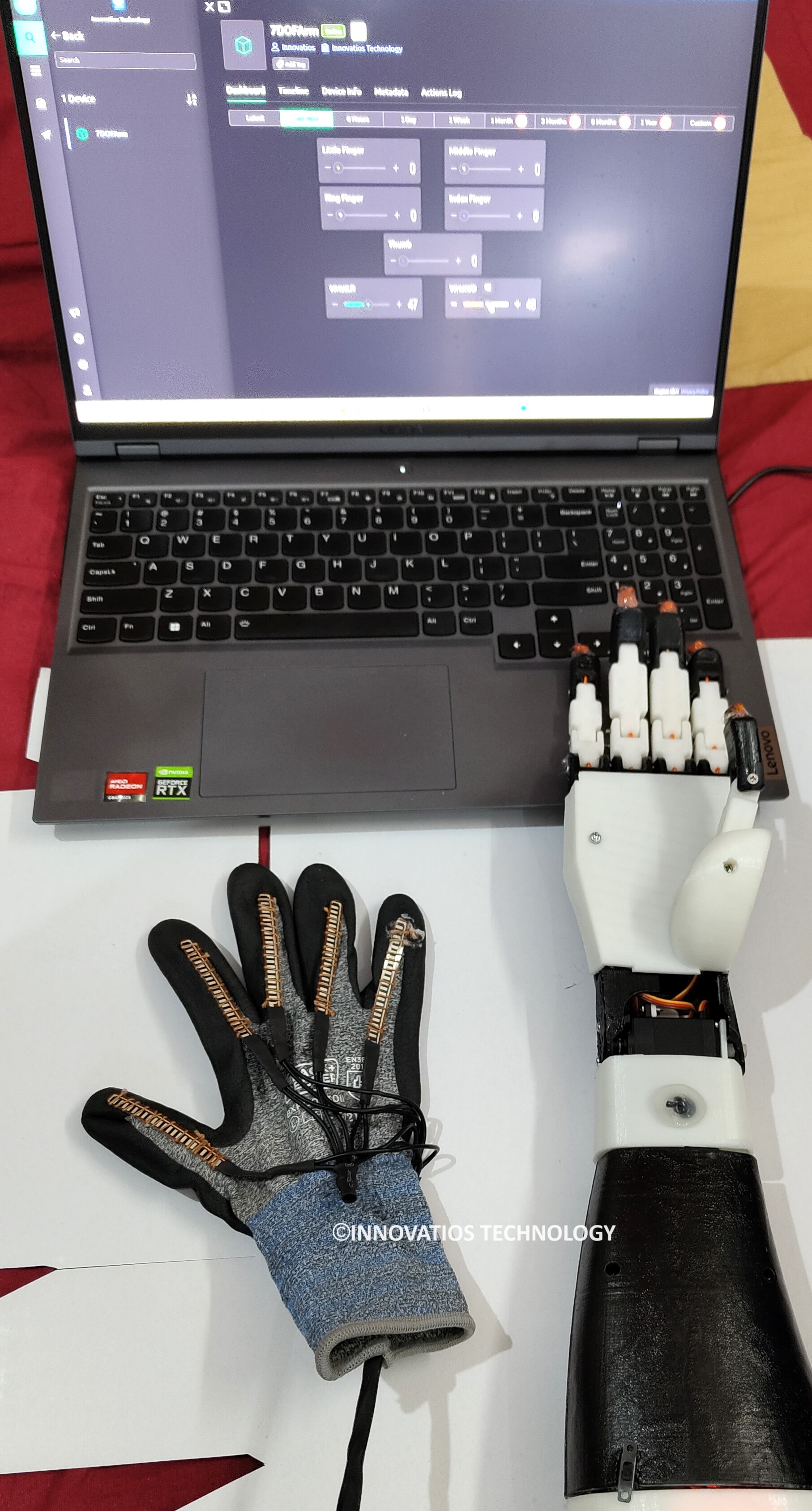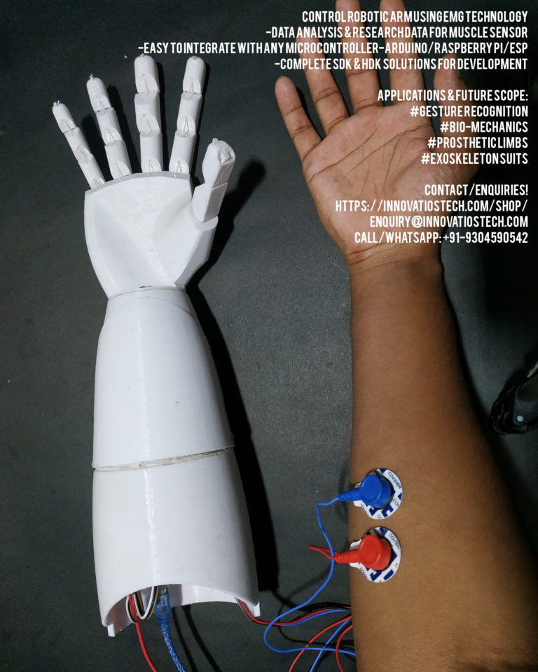 https://innovatiostech.com/product/7dof-robotic-arm/ https://www.youtube.com/watch?v=cPhhv5gLspk Features: -DOF for 5 fingers & 2 wrist control(PTZ) -5 micro servo & 2 standard servo -Control via WiFi & Blynk IoT -Scalable hardware for customizations -Design customizations available -Best for evaluation of EMG(Electromyography ) Technology