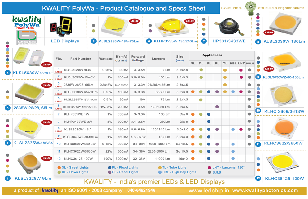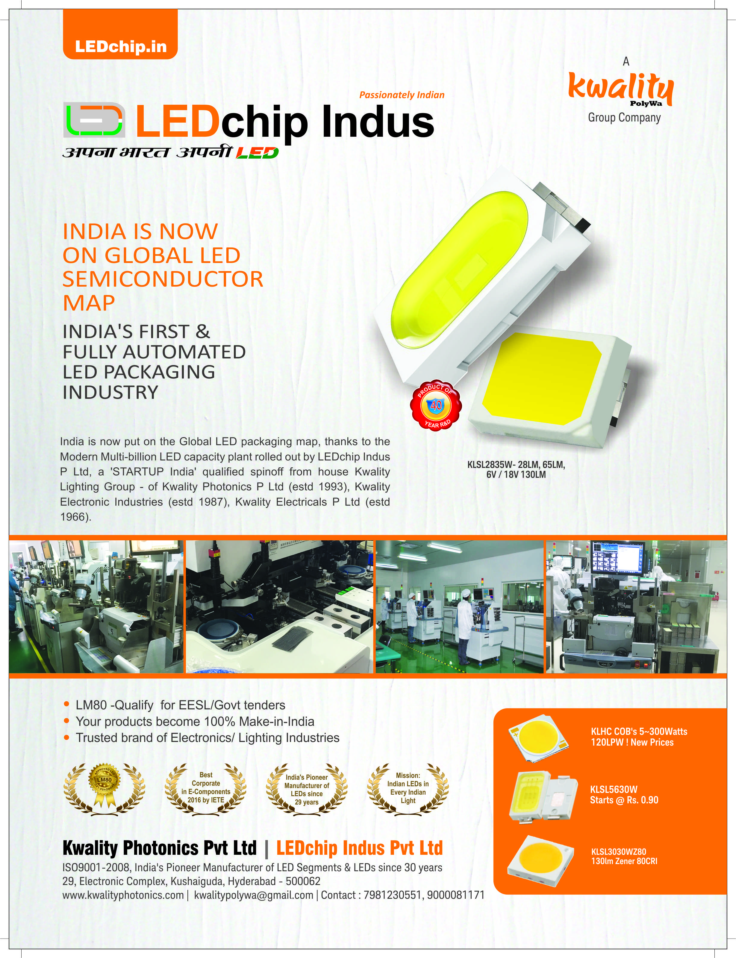 | LEDchip Indus P Ltd is Manufacturer of High-Reliability SMD LEDs - in fully Automated LEDs plant, product is un-touched by hand, under Class 10K Dust-free Airconditioned environment. Kwality Photonics / LEDchip Indus ? Kwality Electronics are India's Pioneer & Sole producers of LEDs sonce 1987. The group has 5 decades of glorious history as producers of Lighting for Railway Signalling, Merchant navy, Automotive OEMS and Industrial indicatr Bulbs, |